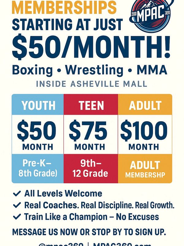 Experience the energy, community, and coaching that make MPAC 360° one of Asheville’s top training facilities. We’re offering a free class for new visitors — no commitment, just a chance to see what we’re all about. Whether you’re interested in boxing, wrestling, MMA, or fitness training, this is the perfect way to get started. Claim your free class today and see why so many athletes call MPAC 360° home.